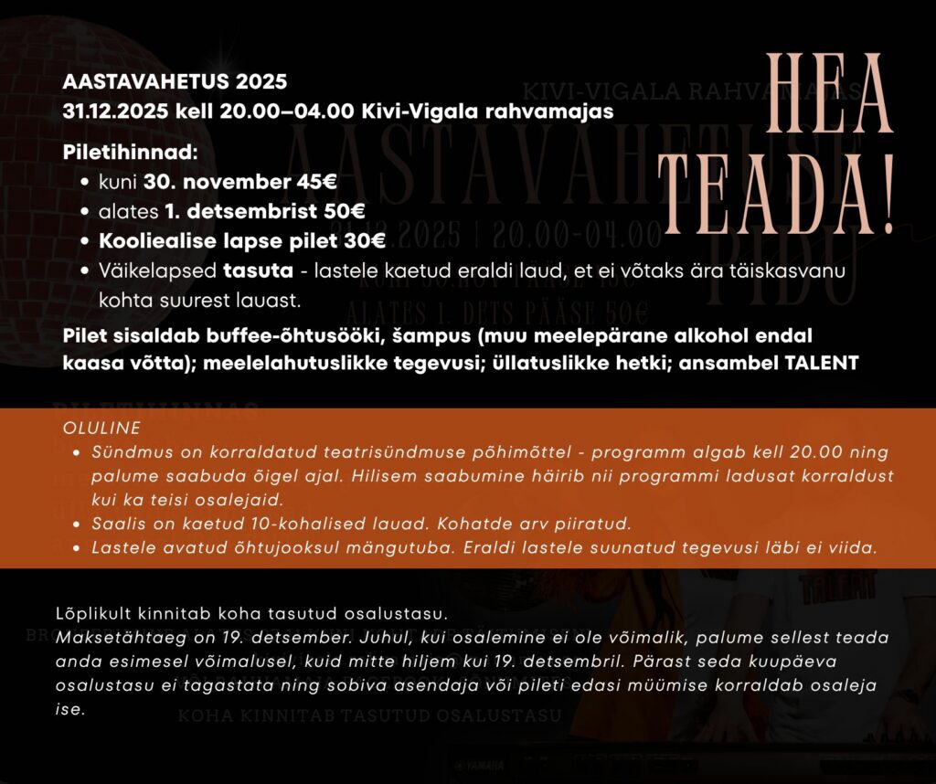 November 30, 2025 HomeUncategorizedAastavahetus Kivi-Vigalas Aastavahetus Kivi-Vigalas By Liina Kikas Uncategorized 0 Comments Related Posts Kogemusreis Avatud Taludesse Saaremaale Kodukandi pajatuste kogumik Jaanituli koos küladepäevaga About Author liina Add a Comment Cancel replyYour email address will not be published. Required fields are marked *Comment:*Name:* Email Address:* Website: Save my name, email, and website in this browser for the next time I comment. Δ